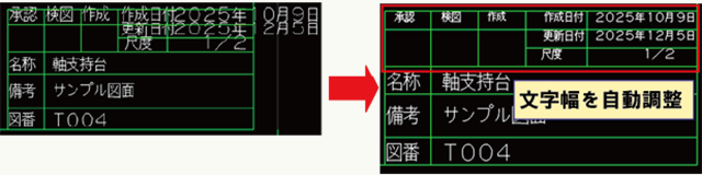 他社CADからデータを変換して取り込んだ際、フォントの違いによって図枠から文字列がはみ出してしまう場合でも、自動補正により枠内に収めることが可能です。