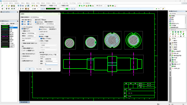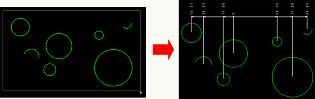 プレートなどに多数の穴を開ける際、円を自動認識し、基準点と寸法線の引き出し位置を指定するだけで、簡単かつ効率的に累進寸法を作図できます。