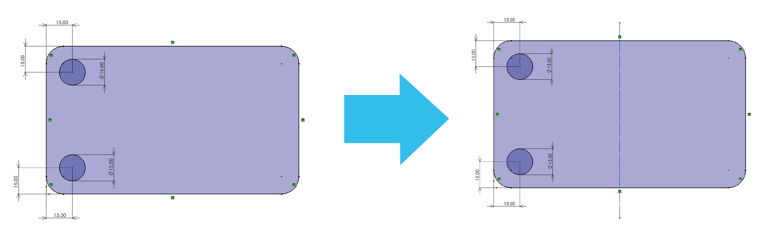 スケッチ作図コマンドでは、従来のスケッチコマンドにはなかった便利な機能を搭載しています。例えば、基準となる2本の線分を選択することで、線分間に中線を簡単に作成することが可能です。また、線分の分割点も手軽に作図できるため、2次元で作図する感覚でスムーズに操作が行えます。これらの機能を活用することで、次のような作業が効率的に行えます: