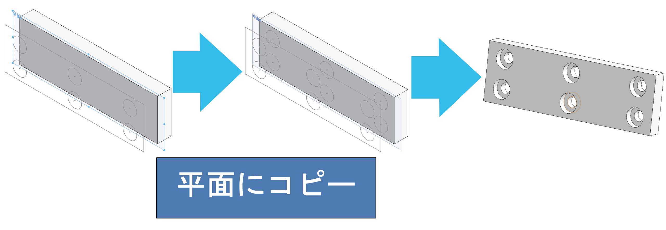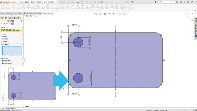 2次元からインポートしたスケッチを別の平面にコピーしたいというご要望にお応えし、新たに「スケッチ間要素複写コマンド」を搭載しました。例えば、穴をあける平面にインポートした穴のスケッチをコピーすることで、穴ウィザードを使用し、一括で穴をあける作業が可能になります。また、インポートした穴スケッチに中心点がない場合でも、自動的に円を認識し、中心点を作図する機能も備えています。これにより、設計作業の効率が大幅に向上し、スケッチ操作の利便性がさらに向上しました。