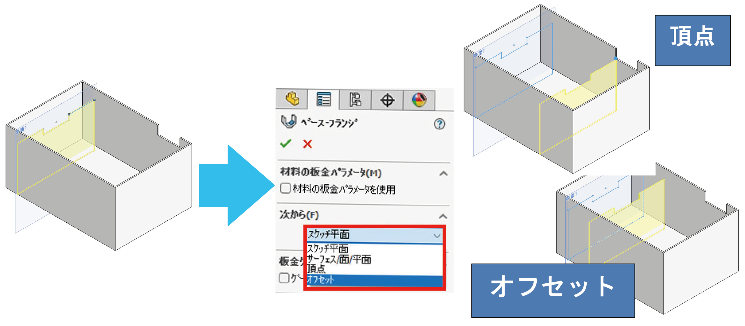 ベースフランジの開始位置を柔軟に選択できる機能を新たに搭載しました。従来はスケッチ平面からのみ作成可能でしたが、「CADSUPER WorksⅡ」2026年度版では、以下のように開始位置の指定が可能となります。