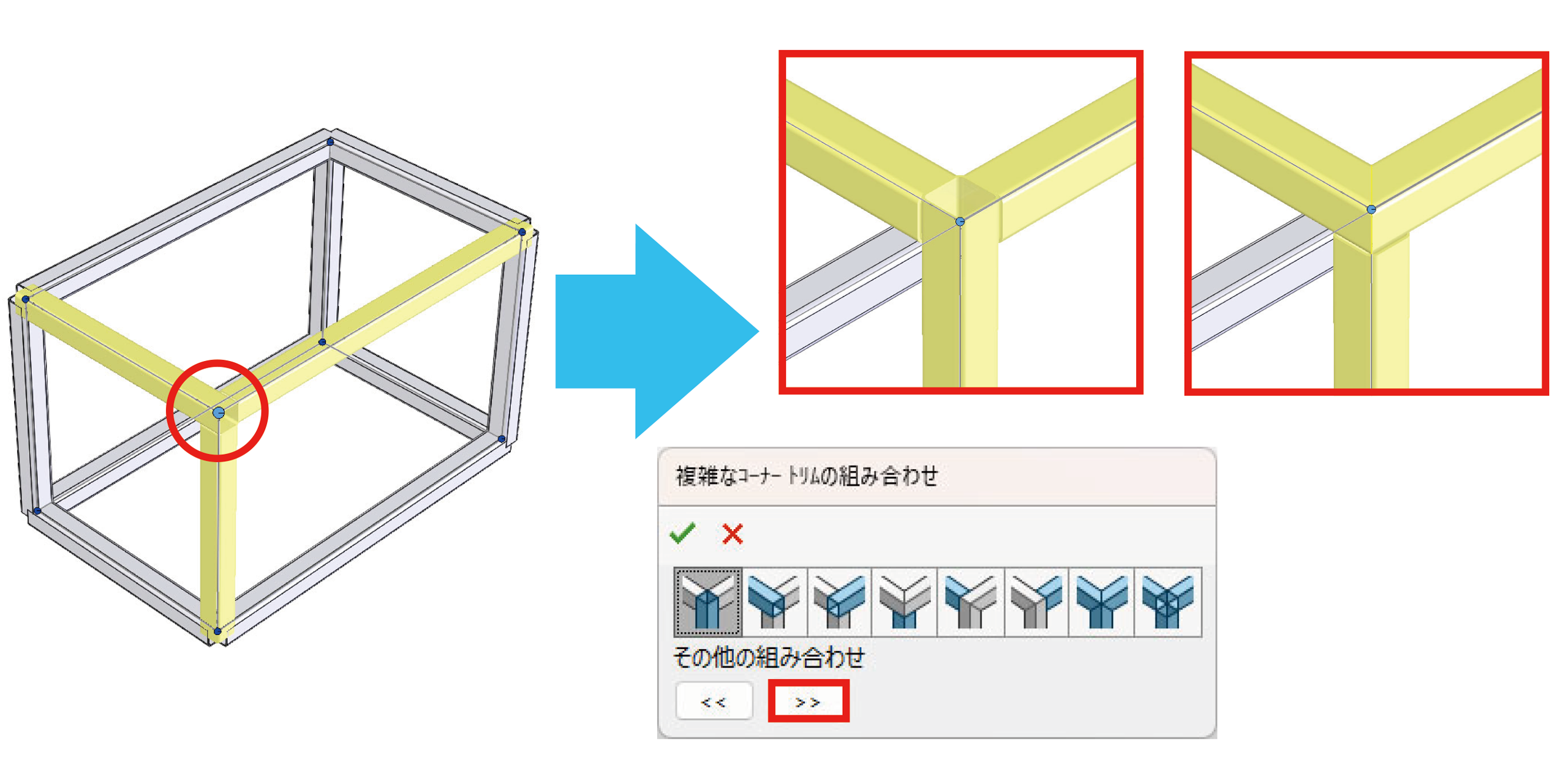 コーナーのトリムタイプを直感的に操作できるよう機能が改善されました。選択したコーナーが色分けされるため、選択箇所を視覚的に確認することが可能です。また、ダイアログボックス内の矢印をクリックするだけでトリム形状を変更できる仕様となり、操作性が向上しました。これにより、コーナーのトリム操作がより見やすく、効率的かつ簡単に行えるようになりました。