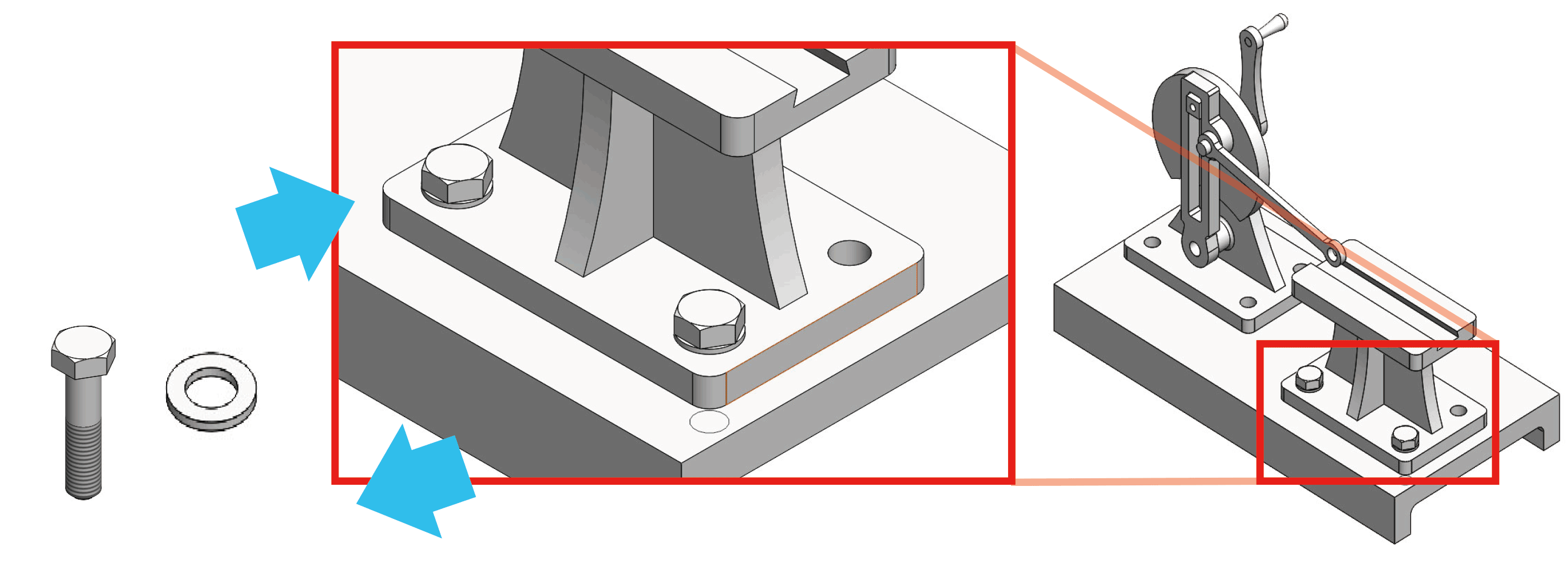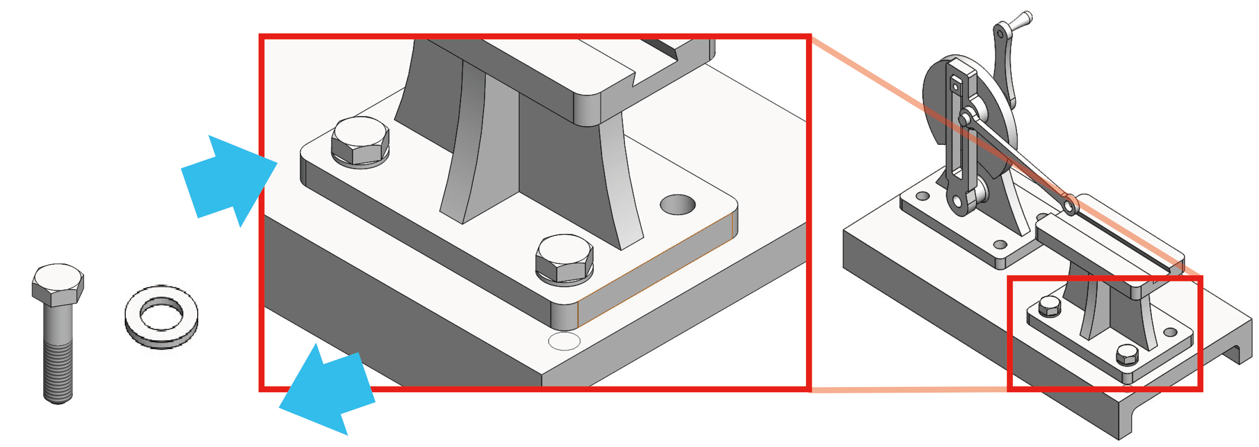 AIが形状をもとにボルト、ナット、ワッシャーなどの構成部品を認識し、自動的に合致を追加できる機能を搭載しました。従来のように合致参照を手動で指定する必要がなく、