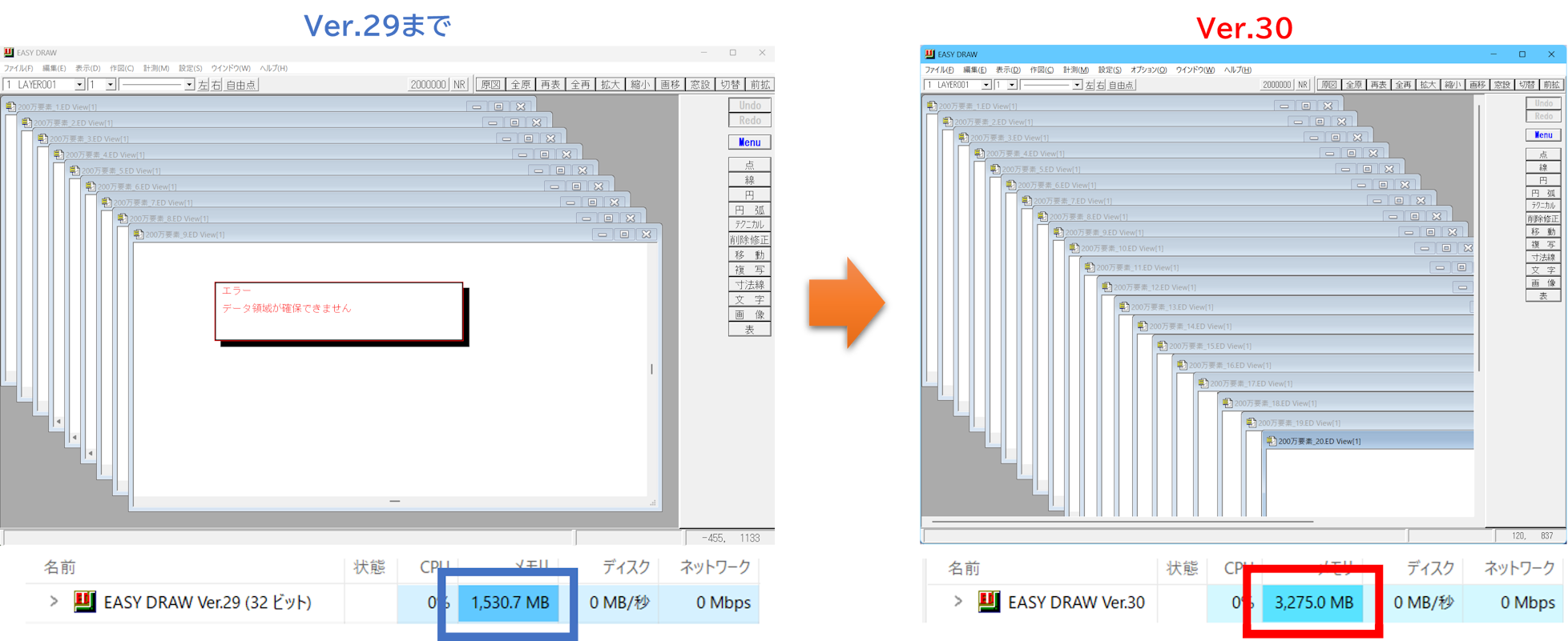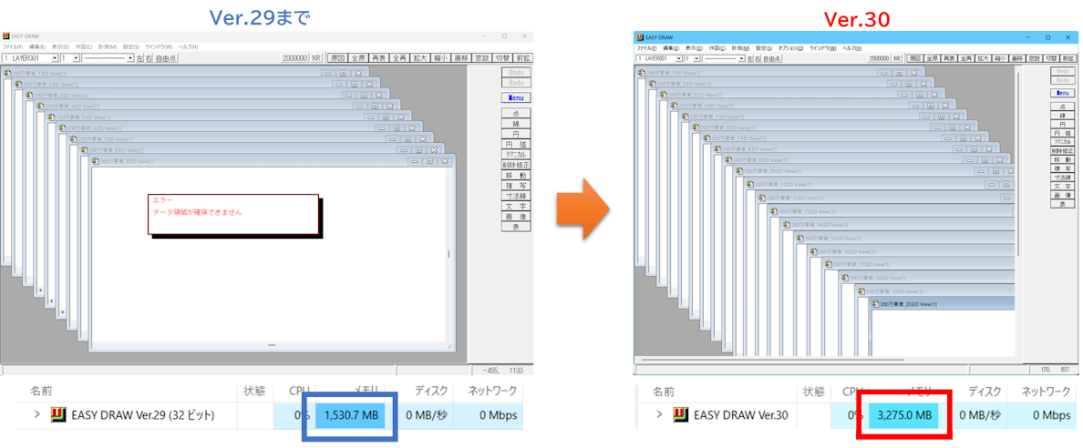 メモリの使用上限が強化され、要素の多い図面の同時編集や多数の画像表示が可能になりました。