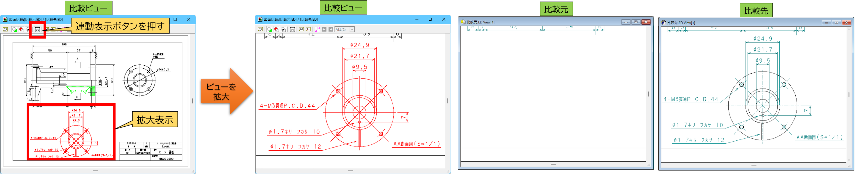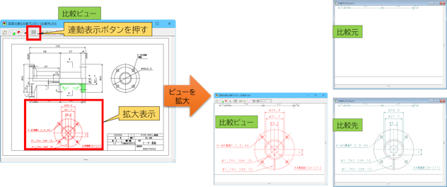 ①連動表示:比較中の図面と図面比較ビューの表示倍率と位置を連動させる機能を追加しました。