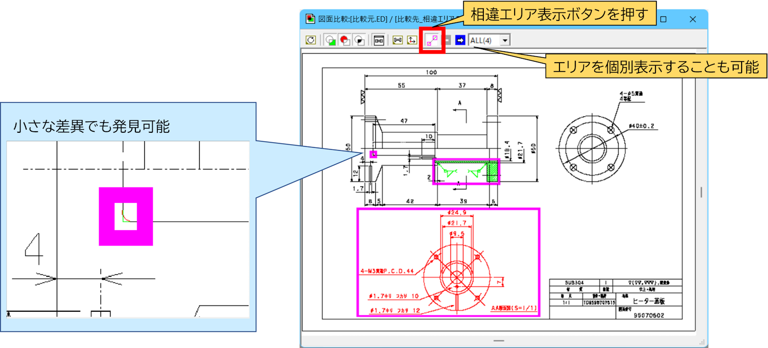 ③相違エリア表示:比較結果から検知した変更箇所にエリア分けを行い、表示する機能を追加しました。