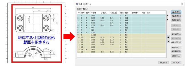 「検査寸法表ツール」は、CAD図面から検査表に載せるための各種数値を自動的に抽出します。